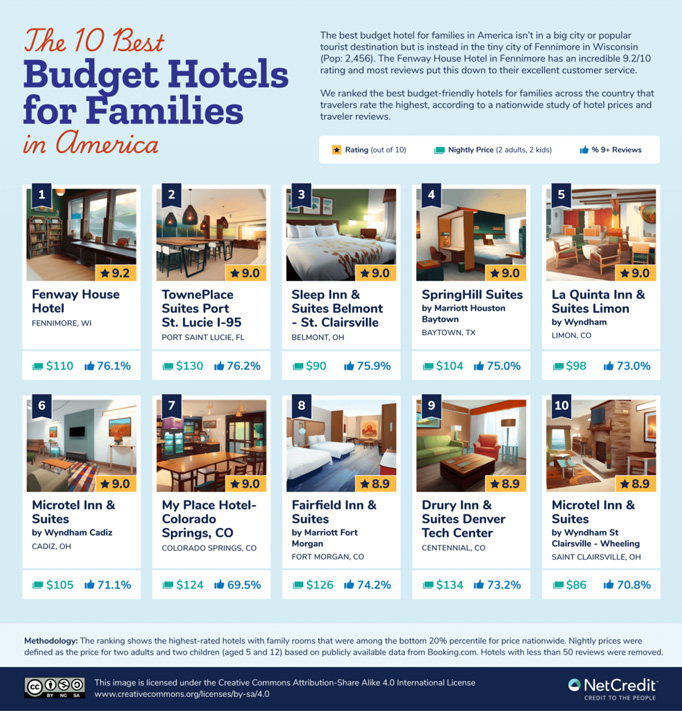 Traveling around the country with your family can be fun. It can cost a fortune if you don’t do your homework on hotel accommodations. This infographic from NetCredit covers 10 budget hotels for families in America: