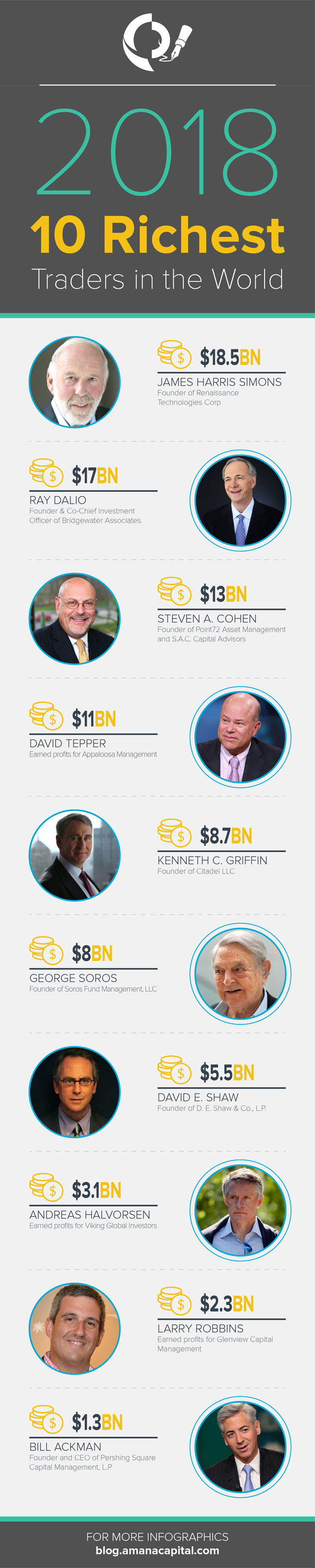 It is no secret that you can build a huge fortune trading if you know what you are doing. The most successful traders have accumulated billions in wealth. This infographic from Amana Capital – Trusted Forex Broker takes a look at the richest traders around the world in 2018: