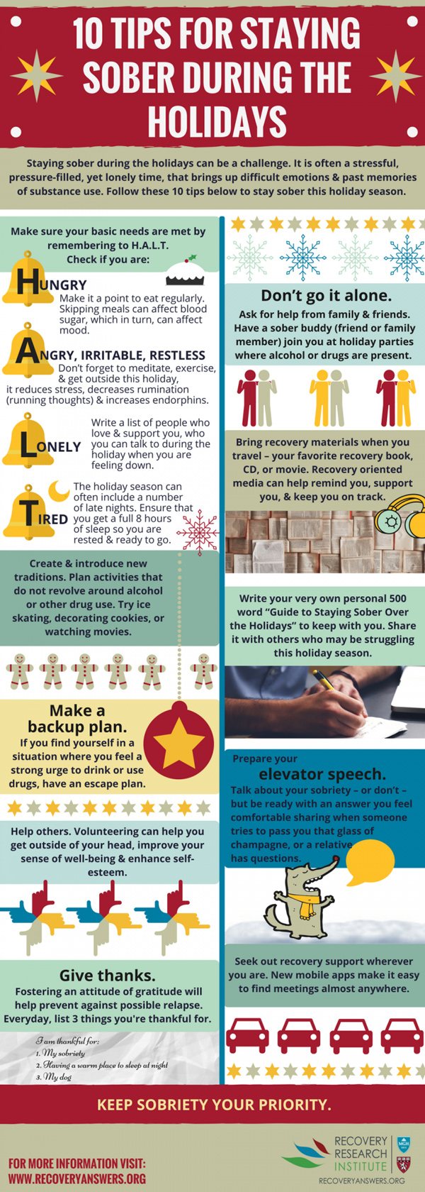 A lot of us are guilty of drinking a little bit during the holiday season. Staying sober can be a challenge without the right people around you. This infographic from Recovery Research Institute helps you stay sober during the holidays:
