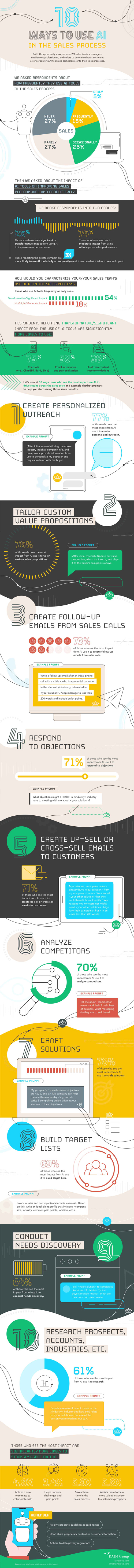 There is more to AI than talking to ChatGPT or creating images with Midjourney. Plenty of businesses will be relying on it to improve their sales processes. This infographic from RAIN Group covers 10 ways to use AI in the sales process: