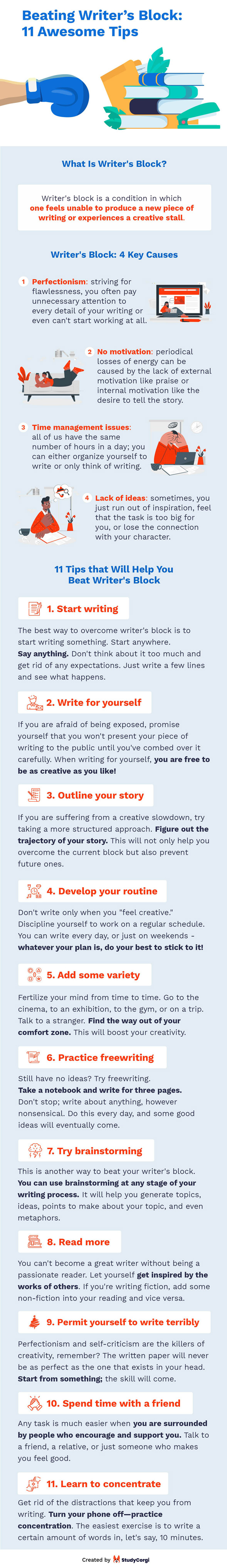 We all hit a creative wall whether it is in writing or at work. Lack of motivation, bad time management, and perfectionism can all contribute to that. This infographic from Study Corgi has a few tips on beating writer’s block: