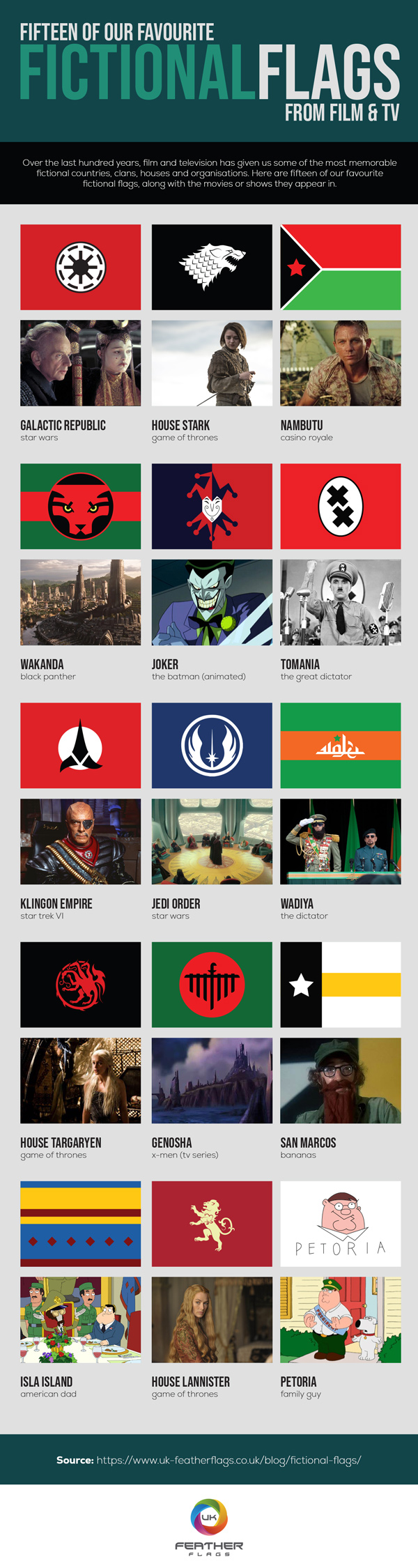 Over the past few centuries, there have been many iconic flags in movies and TV series, including those in Star Wars and Game of Thrones. This infographic from Feather Flags covers 15 fictional flags from film and TV:
