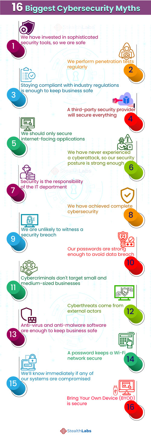 All businesses are taking action to protect themselves against security attacks. You can’t do that unless you shed misconceptions about cybersecurity. This infographic from StealthLabs takes a look at 16 biggest cybersecurity myths: