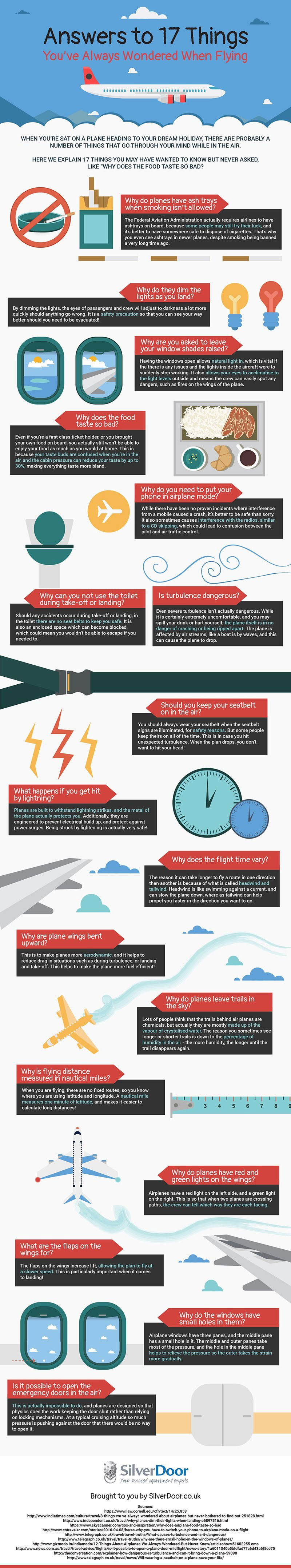 Have you ever caught an air flight and wondered why the food tastes bad or why you can’t use the toilet during take-off or landing? This infographic from SilverDoor has answers to 17 things you may have wondered about flying: