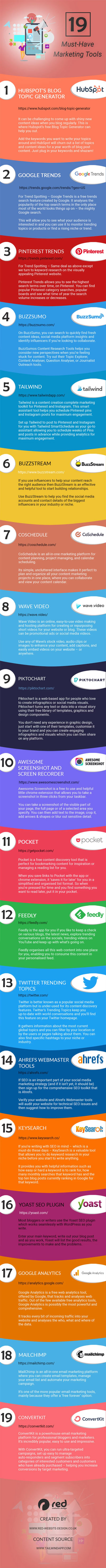 All businesses know the importance of investing in the right tools to keep their marketing efforts on track. Not all marketing tools are expensive either. This infographic from Red-Website-Design takes a look at 19 marketing tools you should know about: