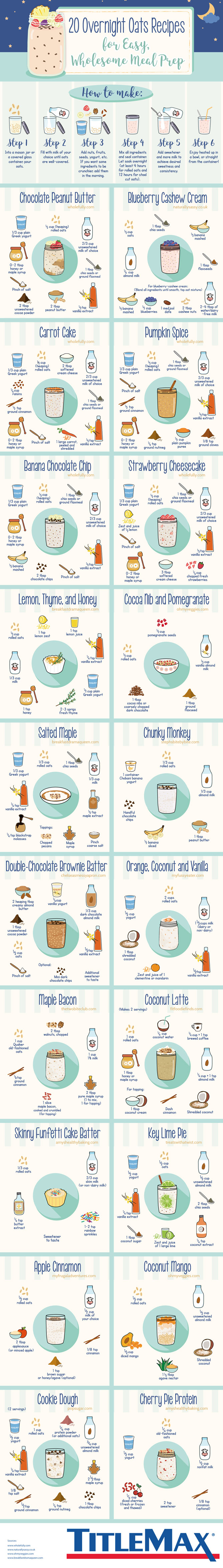 Most of understand the importance of having a healthy breakfast to start off our day. You don’t have to spend a whole lot of time making it though. This infographic from TitleMax covers 20 overnight oat recipes you should try: