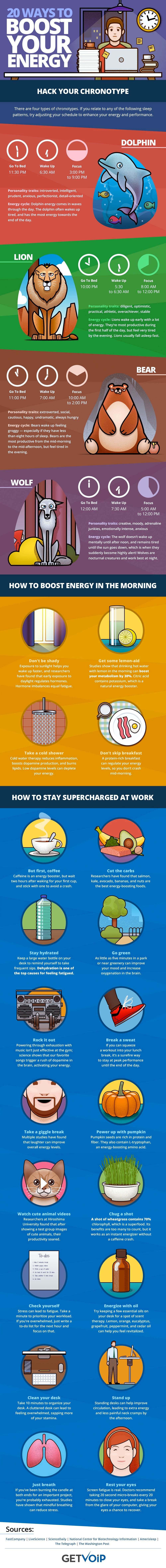 Have you ever wanted to have more energy throughout the day? Getting your sleep cycle on track is one way to stay sharper. This infographic from GetVoiP takes a look at a few other steps you can take to boost your energy at work: