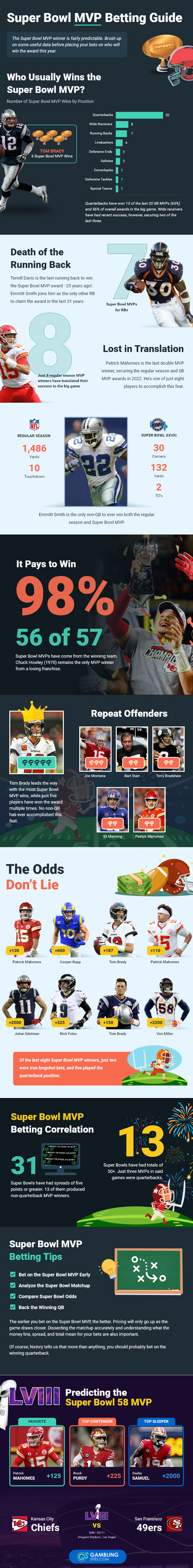 The 2024 Super Bowl is almost upon us. Once again, we have Kansas City Chiefs competing for it. A lot of fans get excited for the game by watching predictions and studying odds. This infographic from Gambling Sites has more info on 2024 Super Bowl MVP odds: