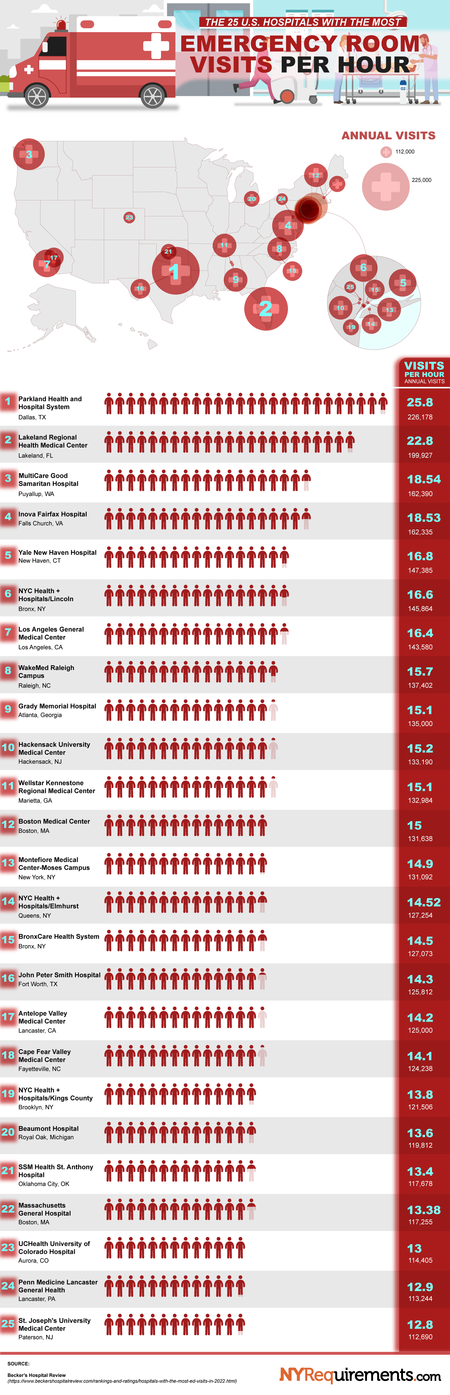 Those of you who have worked at a hospital in the past or even visited one know how busy they can be. A lot of people have to visit the emergency room to get urgent attention on a daily basis. This infographic from NY Requirements visualizes the 25 US hospitals with the most emergency room visits per hour: