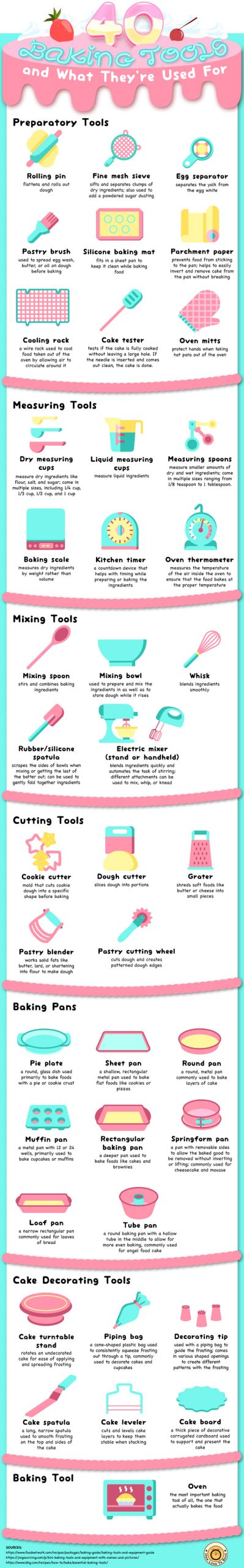 You can’t expect to become a great baker if you don’t know how to use common kitchen tools the right way. This infographic from How Long to Bake takes a look at 40 baking tools and what they are used for: