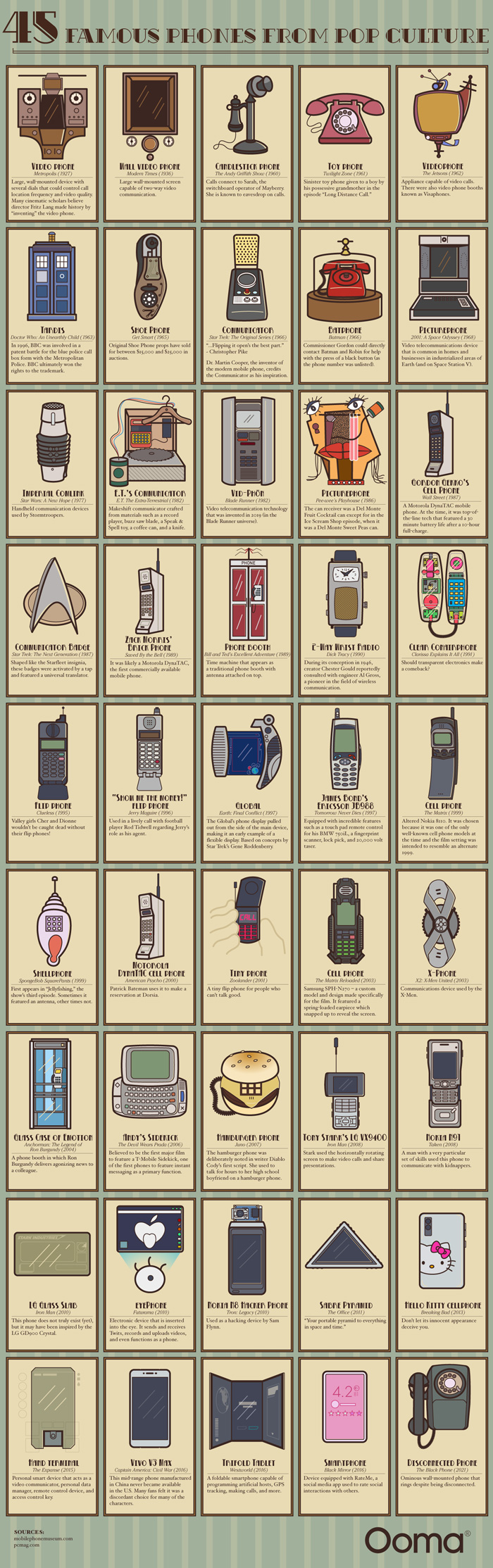 There are plenty of fancy phones around these days. Some of the strangest phone designs are from old books and movies though. This infographic from Ooma covers 45 famous phones from pop culture: