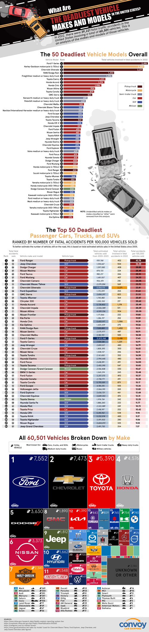 When it comes to getting a new car for your family, you will want to do your homework to check the safety record for your exact model. This infographic from Convoy Car Shipping covers the 50 deadliest vehicle models: