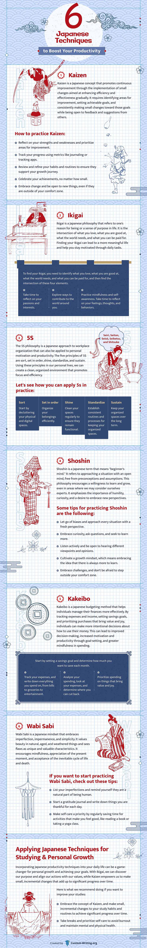 When it comes to productivity, we are all familiar with Pomodoro and other popular methods. By traveling around the world, you can always pick up productivity tips from other cultures. This infographic from Custom-Writing covers 6 Japanese techniques for improved productivity: