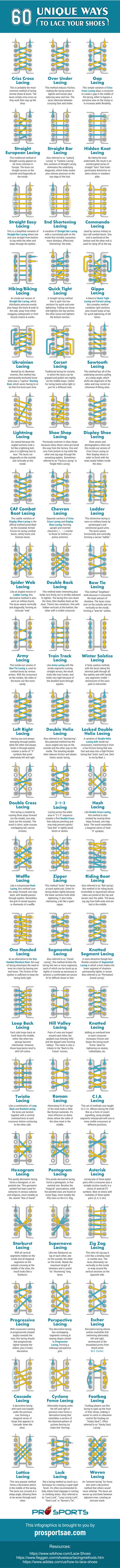 We all learned how to tie our shoelaces when we were kids. There are many ways to lace your shoes though. This infographic from Prosportsae.com takes a look at 60 ways to lace your shoes: