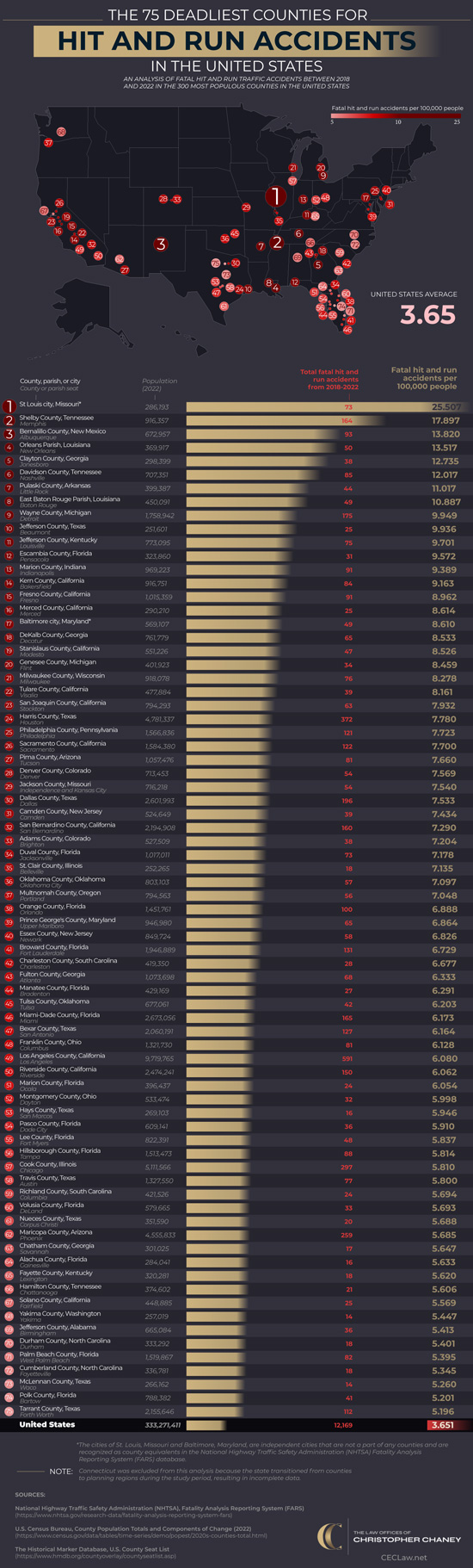 Hit and run accidents claim lives all the time. In fact, every 43 seconds, someone loses their life to these types of accidents. This infographic from the Law Offices of Christopher Chaney covers 75 deadliest counties for hit and run accidents: