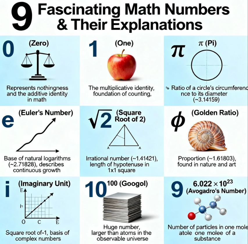 When it comes to math, there are plenty of special numbers most of us know about, such Pi or Euler’s number. Even 0 and 1 are very special in their own way. This infographic covers 9 fascinating math numbers and their explanations: