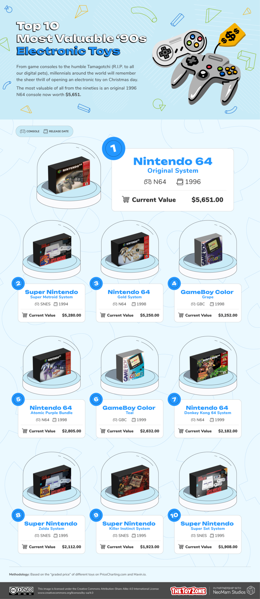We have all seen how some collectible items go for a fortune on sites such as eBay. If you have rare tops from the 90s, they may be worth a lot of money. This infographic form The Toy Zone covers toys from that era that are now worth a fortune: