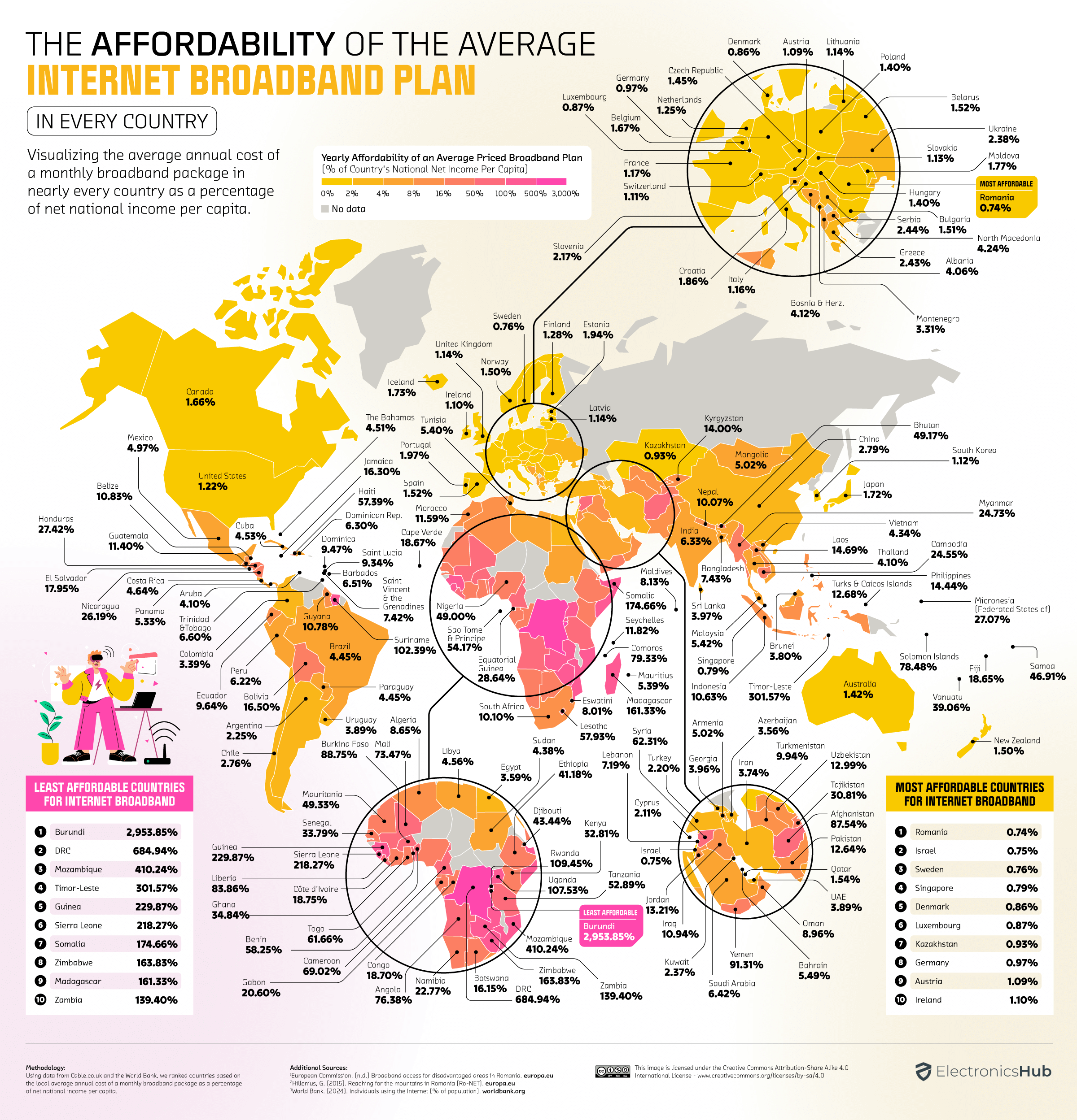 Internet speeds have gone a lot higher everywhere around the world. High speed plans are not all affordable though. This infographic from ElectronicsHub covers the affordability of the average internet broadband plan in every country: