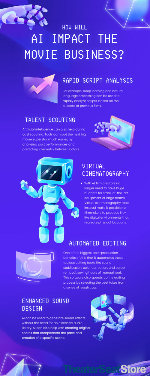 AI is changing the way we work and do business. It is going to change many industries, including the film industry. Theater Seat Store has put together an infographic that covers how AI will impact the film industry: