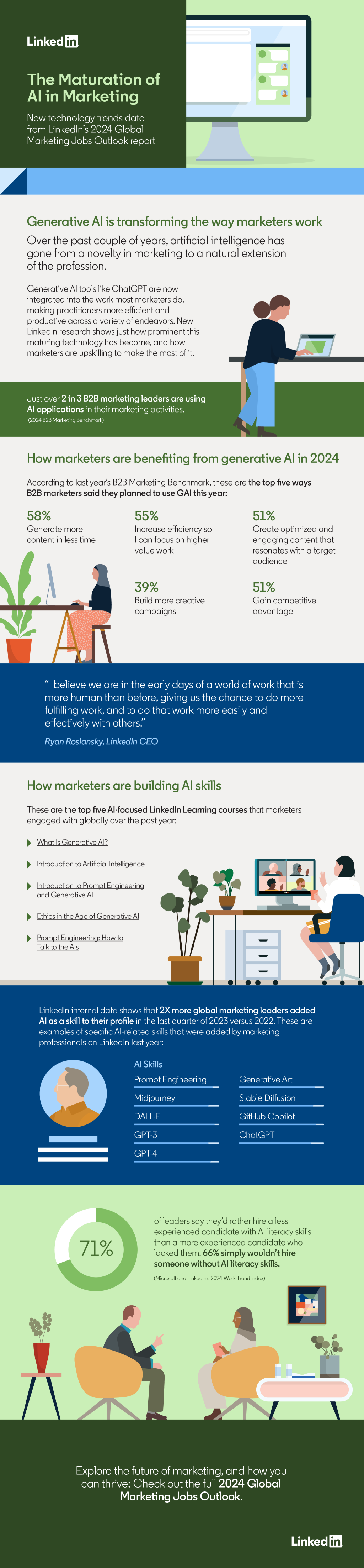 AI is going to change the way we work. Plenty of marketers are now using artificial intelligence tools to reach their audience and get things done faster. This infographic from LinkedIn shows how this technology is maturing: