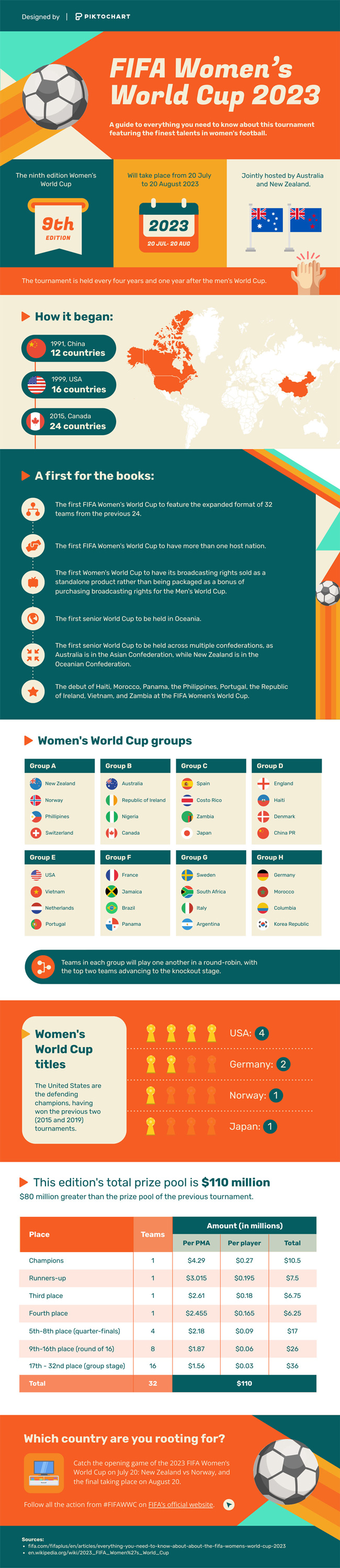 FIFA Women’s World Cup 2023 is finally here. It gives you to opportunity to see some of the best female footballers on the planet. The event will last till August 20. This infographic from Piktochart covers some interesting facts and stats about this event: