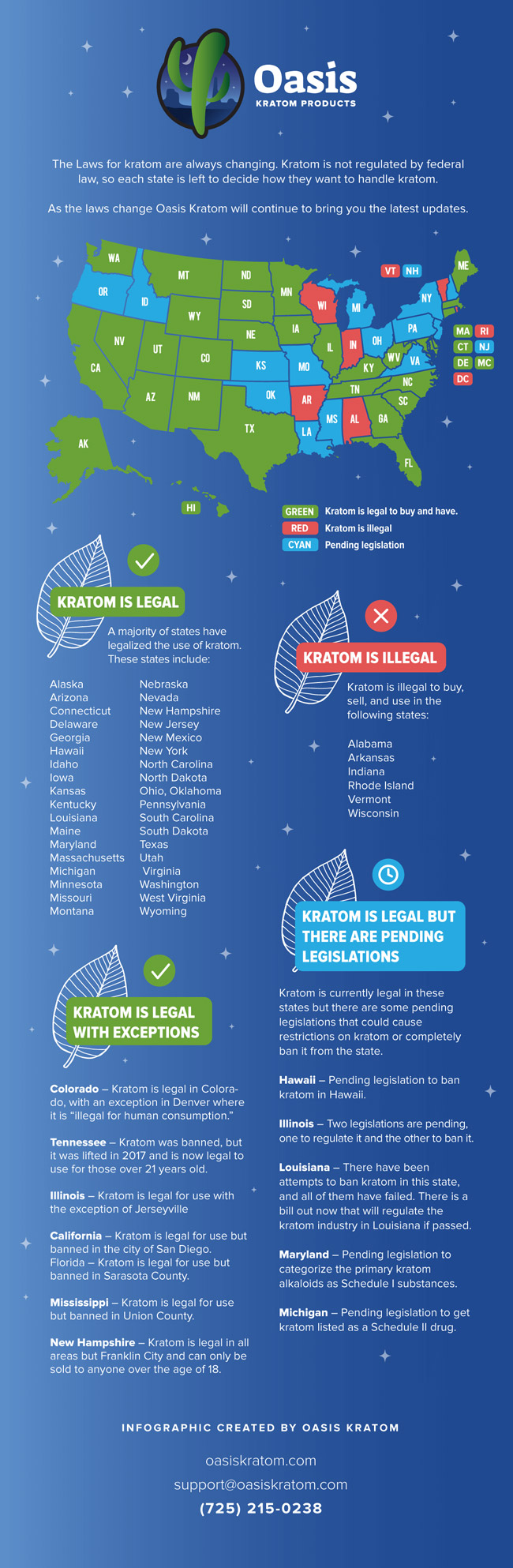 Kratom is used for chronic pain, digestive ailments, and opium dependency. The laws concerning it are always changing though. Oasis Kratom has put together an infographic that visualizes where Kratom is legal to buy: