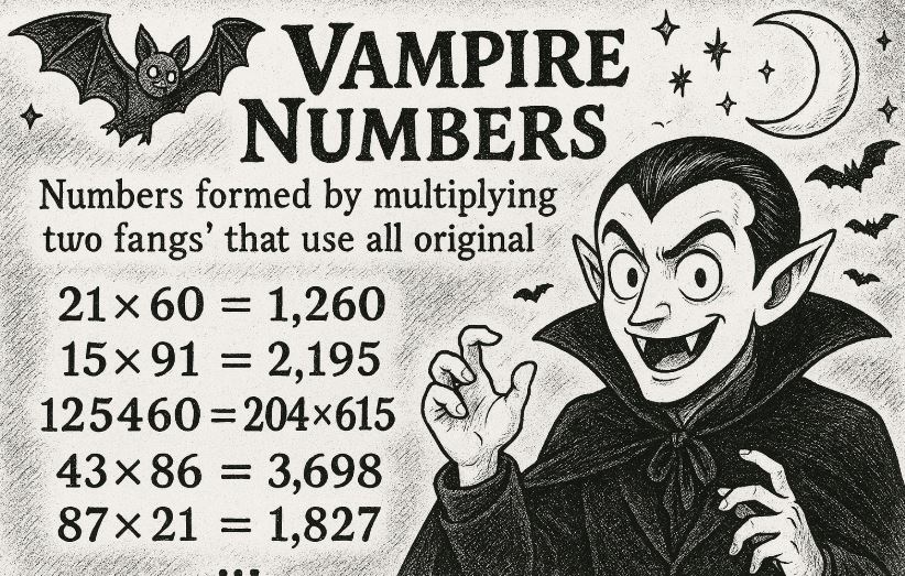 Those of you who have studied math know about certain curious numbers. For example, Palindromic numbers read the same forwards and backwards. Vampire Numbers are also interesting. They are formed by the digits of two numbers multiplied by each other. This visual shows a few of these vampire numbers: