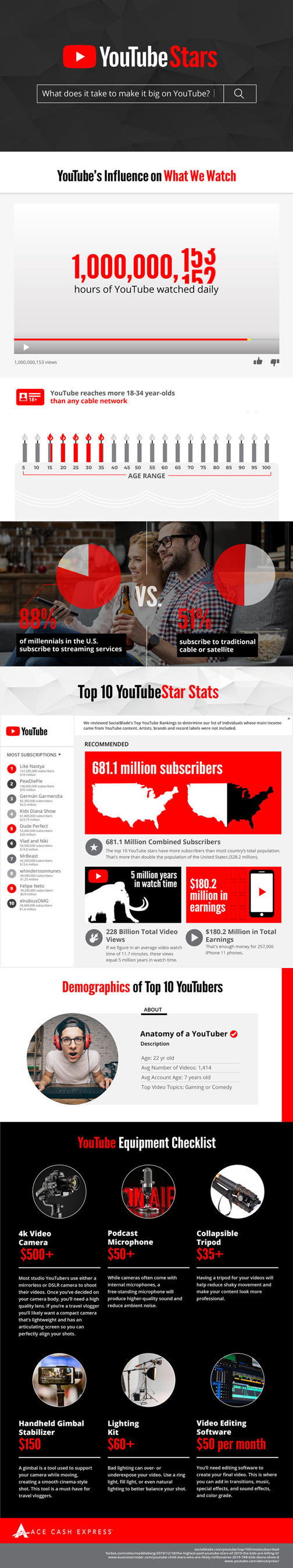 YouTube is one of the most popular sites on the internet with millions of daily views and hours watched. Have you ever wondered how much top YouTube stars earn and how many views they get? This infographic from Ace Cash Express takes a look:
