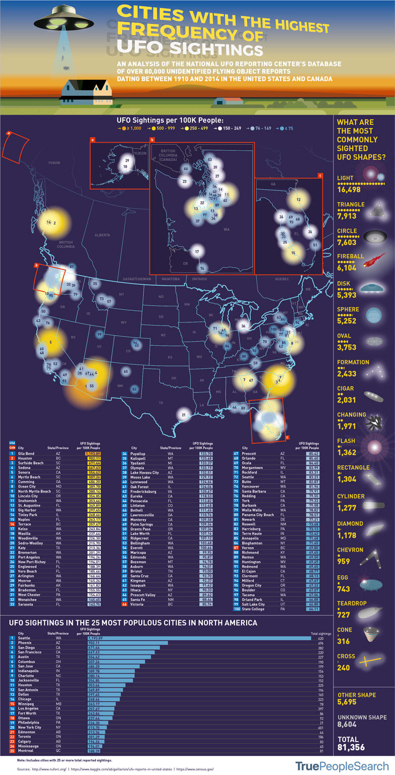 People have been reporting UFO sightings for decades. These tend to happen more often in certain regions. This infographic from TruePeopleSearch ranks American cities by UFO sightings: