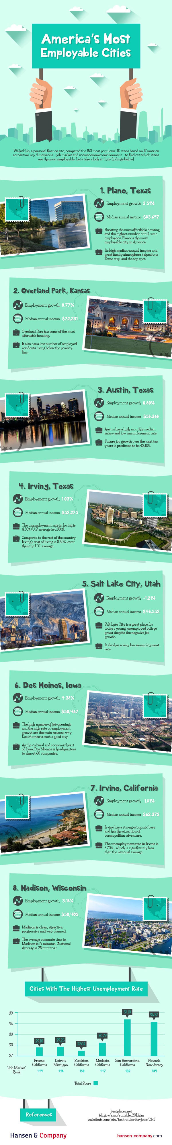 Plenty of people leave their home city or country for better job opportunities these days. Wonder which US cities offer best employment growth and median income? This infographic from Hansen-Company takes a look: