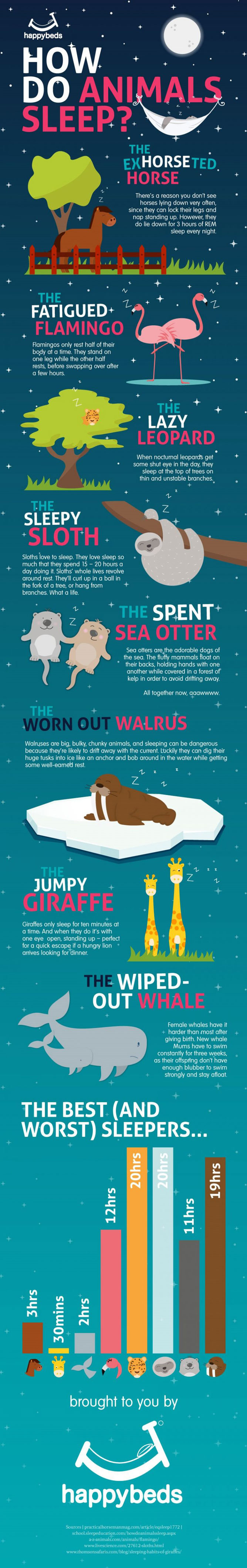 We all need to get proper amount of sleep each night to function at our best. That even applies to animals. This infographic from Happy Beds takes a look at how animals sleep: