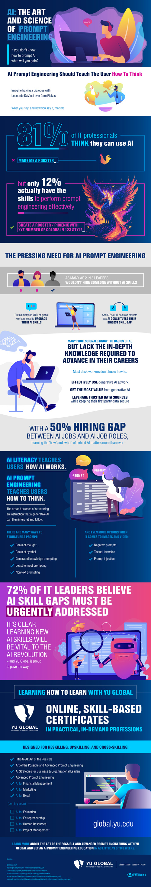 Prompt engineering may look simple on paper but there is a science and art to it. The right prompt can save you a lot of time while getting you the answers you need. There are many ways to structure a prompt, including chain of thought, least to most prompting and non-text prompting as this infographic from YU Global shows: