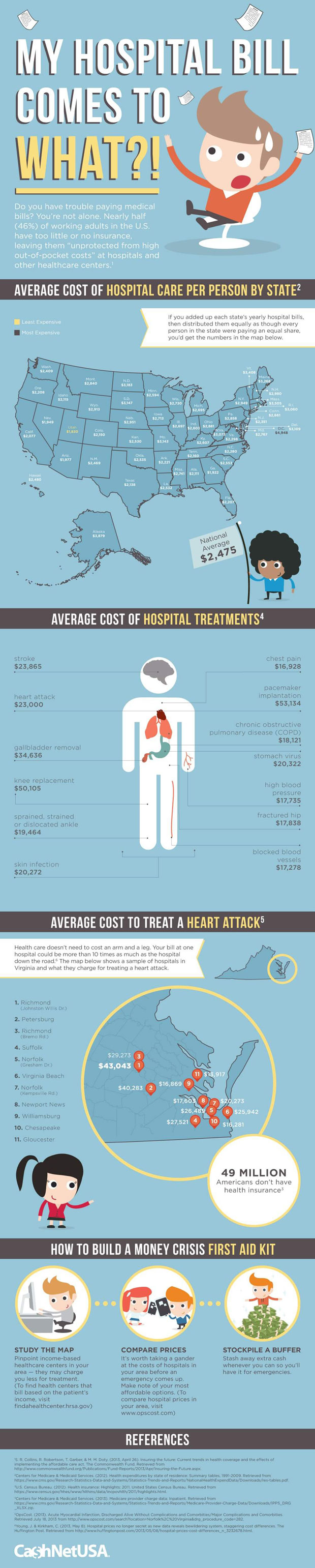 It is no secret that hospital care can be quite expensive, especially if you don’t have insurance. You could end up with hundreds of thousands of dollars in debt if you end up needing a knee replacement, heart attack treatment or worse. This infographic from CashNetUSA takes a closer look at the average cost of hospital care in America: