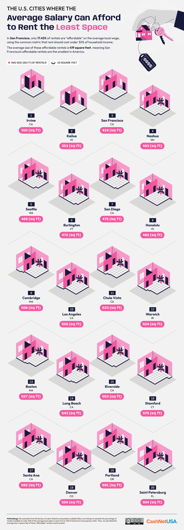 A lot of people move to other cities due to rising costs of living. If you live in Irvine or San Francisco, you can’t expect an average salary to rent you the same amount of space as other regions in the US as this infographic from CashNetUSA shows: