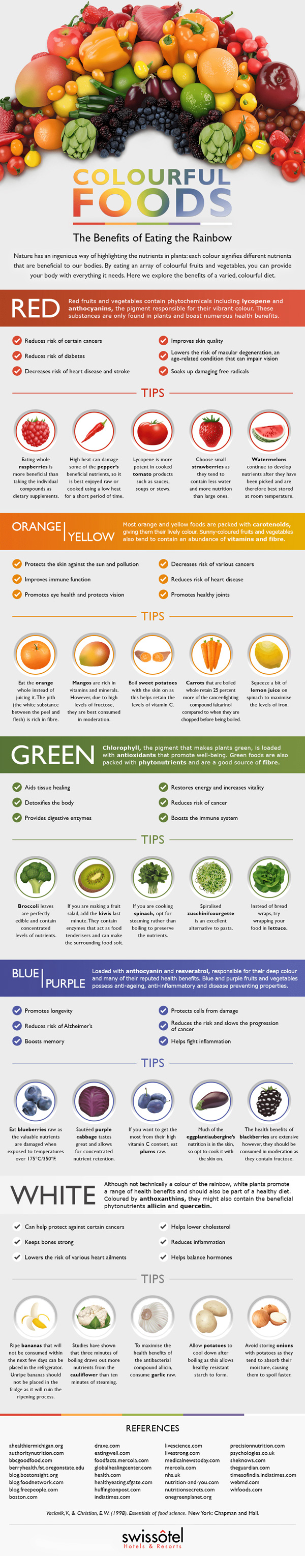 In order to stay healthy and fit, you need to exercise and eat right. swissotel has put together an infographic that covers the benefits of a colorful diet: