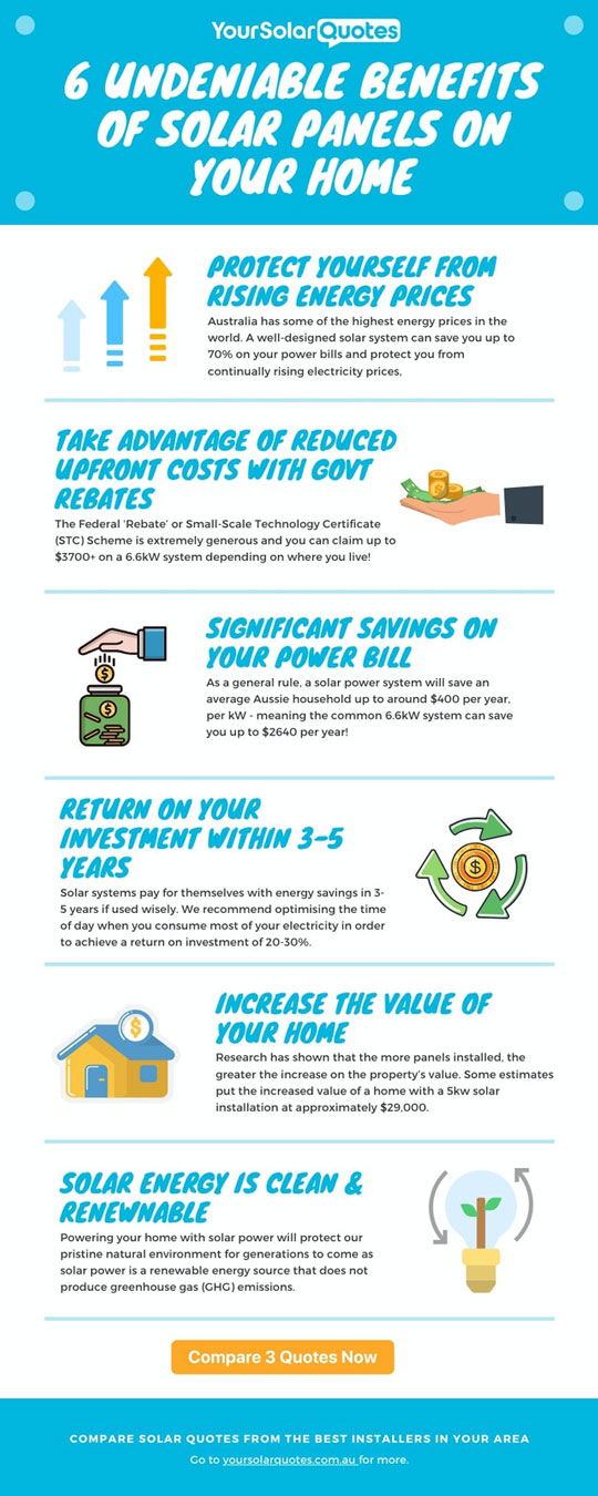 There is a very good reason more homeowners are investing in solar panels. Solar technology can protect you from rising energy prices and save you lots of money in the long run. Depending on where you live, you may be able to get rebates from the government too. This infographic from Your Solar Quotes shares various benefits of going solar this year: