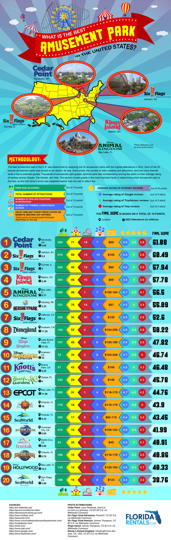 Amusement parks have been around for decades. Did you know that the first one was established in Bristol, Connecticut, in 1846. Since then, the United States has gotten iconic amusement parts. This infographic from Florida Rentals covers the best amusement parks in the US, taking into account ticket prices, # of attractions, size, and other factors: