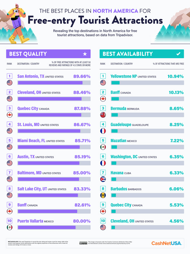 Traveling around the world can be costly if you don’t do your homework. Many destinations have free-entry tourist attractions, so you will want to plan your trip to take advantage of those. This infographic from CashNetUSA covers the best places in North America for Free-entry Tourist Attractions: