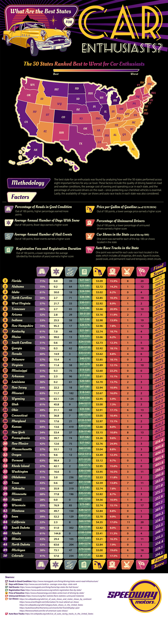 If you are a car enthusiast, you will want to live in an area that gives you the best access to car shows and has opportunities to drive your fancy car on a decent auto race track. This infographic from Speedway Motors takes a look at the best states for car enthusiasts: