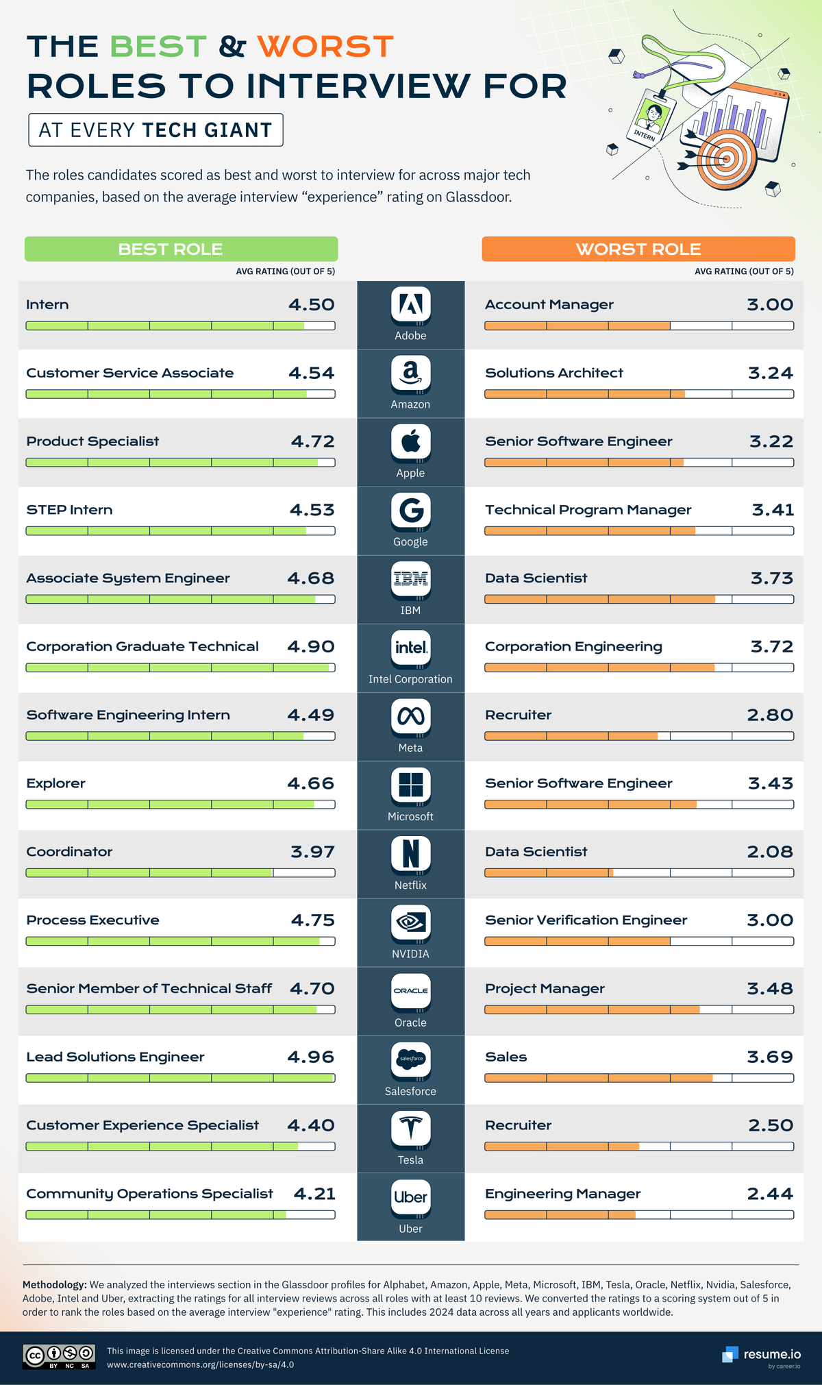 Getting a job at tech giants takes a lot of work. You not only need to have an impressive resume but should also ace your interview. This infographic from Resume.io covers the best and worst roles to interview for at every tech giant: