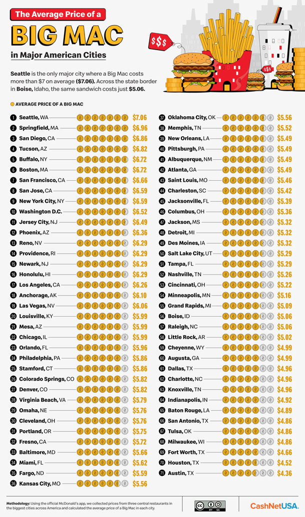 We have all enjoyed a Big Mac or two in the past. With the rising costs of living, it is no secret that food has remained too expensive. This infographic from CashNetUSA takes a look at the average price of a Big Mac in America: