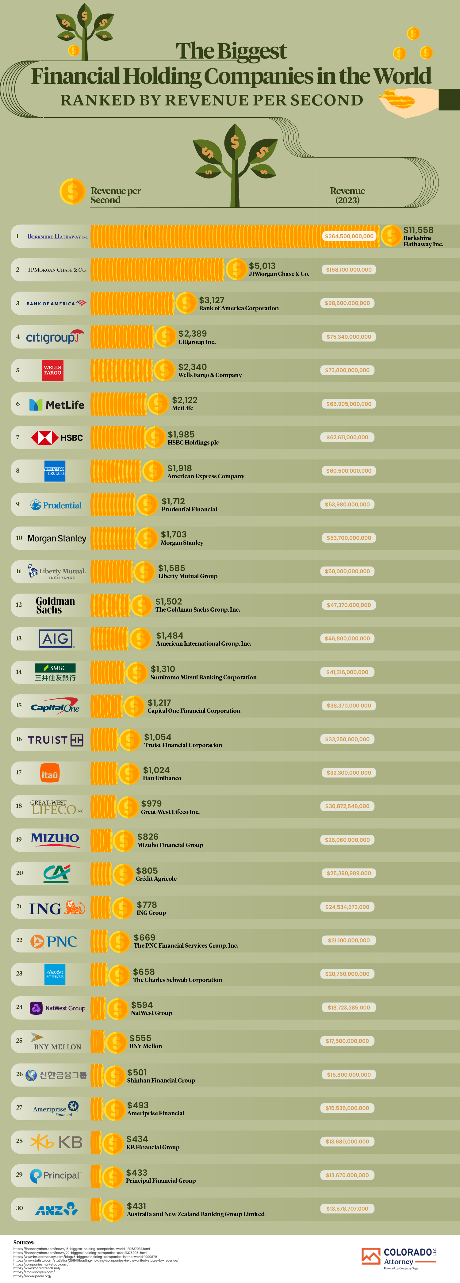 We hear about Berkshire Hathaway, JP Morgan Chase, and other financial companies making a ton of money each year. Have you ever wondered how they stack up against each other based on their revenue per second? This infographic from Colorado LLC Attorney takes a look: