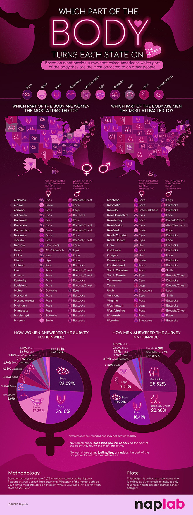 When it comes to the opposite sex, people are turned on with different body parts. Some are turned on with a smile while others are attracted to legs, chest, face or lips. This infographic from naplab visualizes which part of the body turns each state on the most: