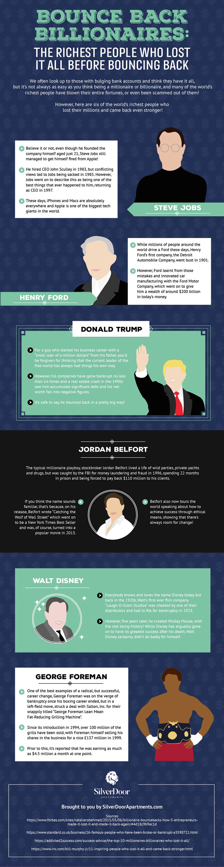 Many people look at famous billionaires and assume they have been always successful. Many of them have had to rebuild their career and wealth multiple times. This infographic from SilverDoor takes a look at the richest people who lost it all before bouncing back: