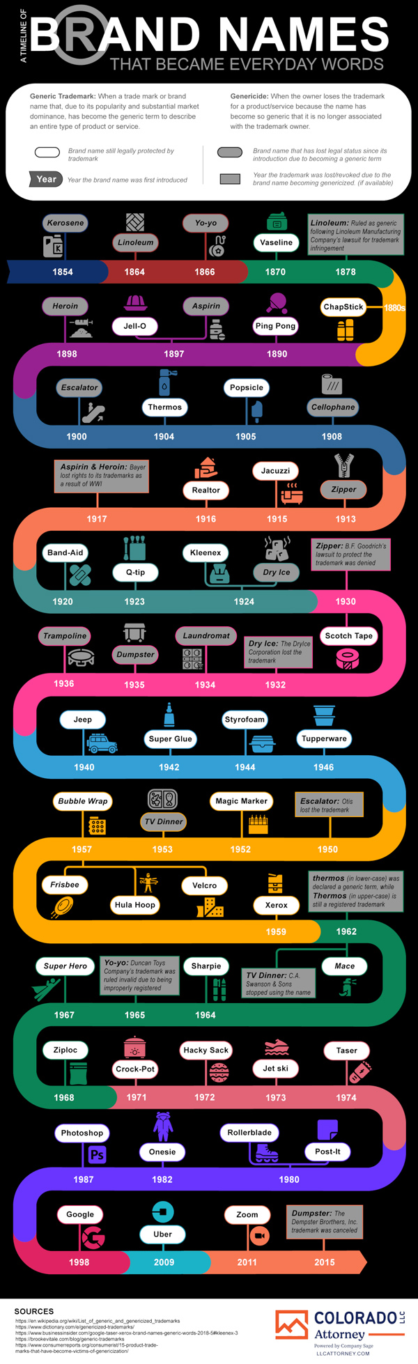 A lot of words we use today were simply just trademarked brands years go (e.g. realtor, Klneenex, and Thermos). That happened due to their popularity and market dominance. This infographic from Colorado LLC Attorney covers a few of these: