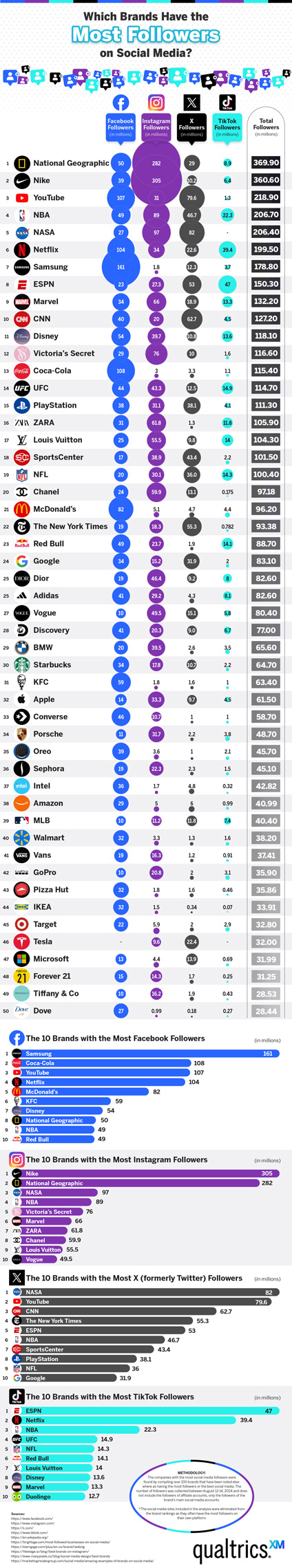 It is no secret that Nike, NBA, NASA, ESPN, Disney, and various other brands and organizations have millions of fans on X, Facebook, Instagram, and TikTok. Have you ever wondered which brands have the most number of followers? This infographic from Qualtrics takes a look: