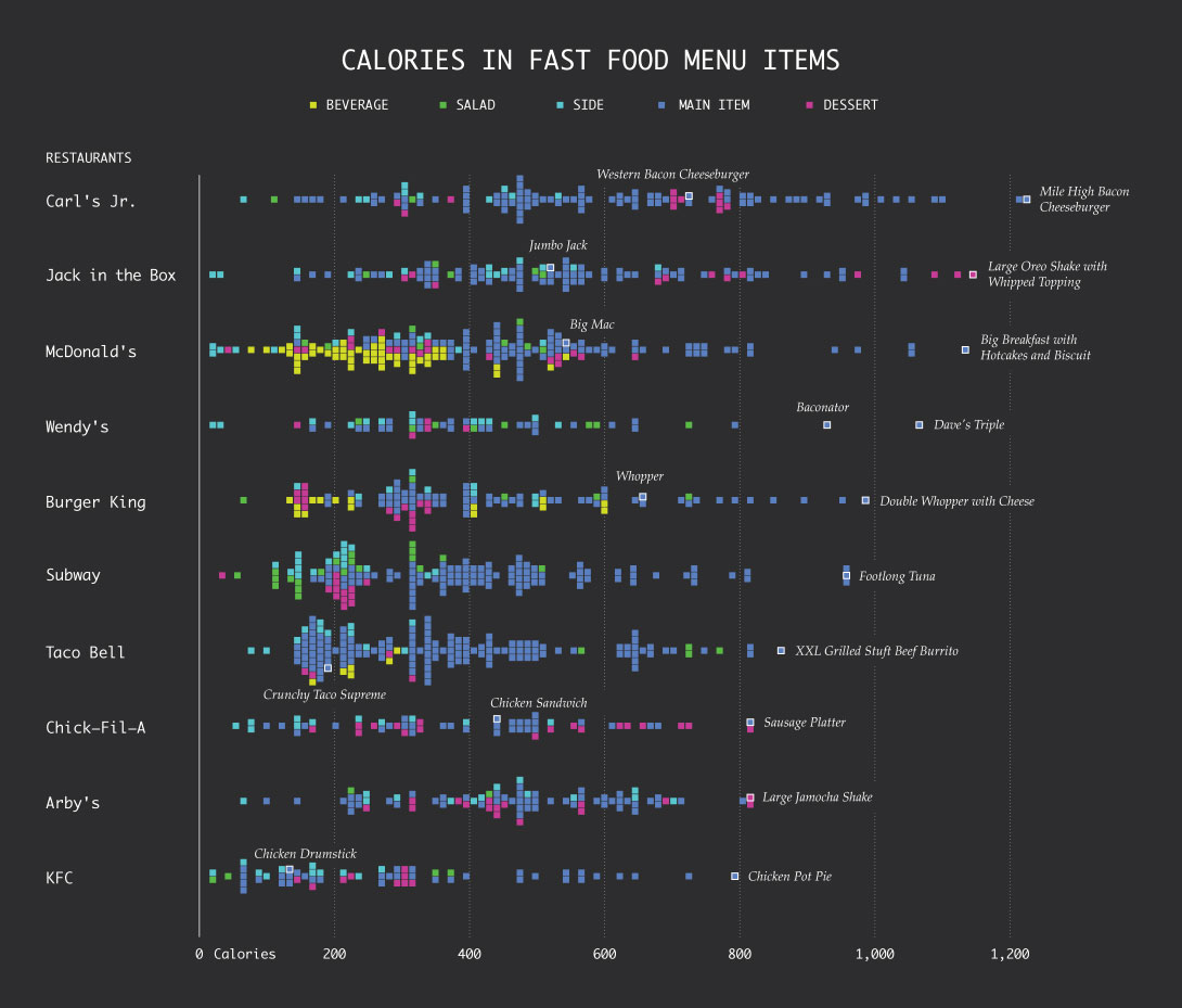 It is no secret that not all fast food items are healthy. Many of them have way too many calories anyway. This infographic from Flowing Data visualizes calories in fast food menu items: