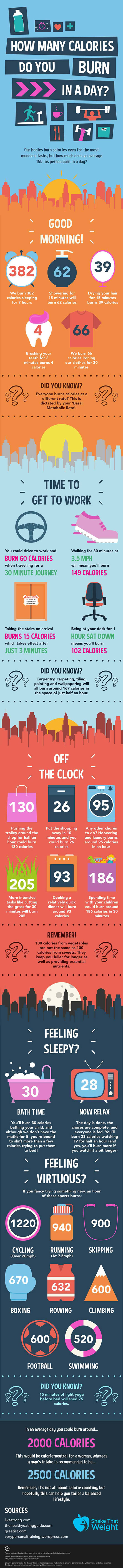 No matter how sedentary your lifestyle, your body will still burn lots of calories every day. This infographic from Shake That Weight takes a look at how much calories you can burn by adding exercise to your daily routine: