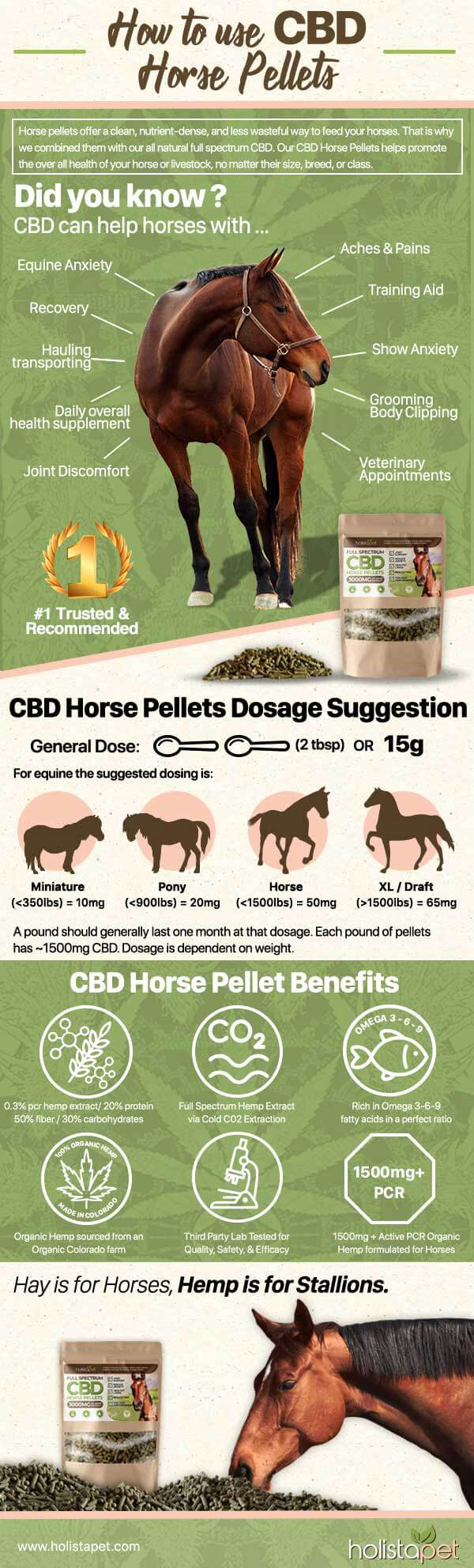 Horse pellets give you an easy, nutrient-dense way to feed your horses with less waste. With CBD horse pellets, you will be able to help your horse with ache & pains and recovery. This infographic from Holistapet covers how to use CBD horse pellets: