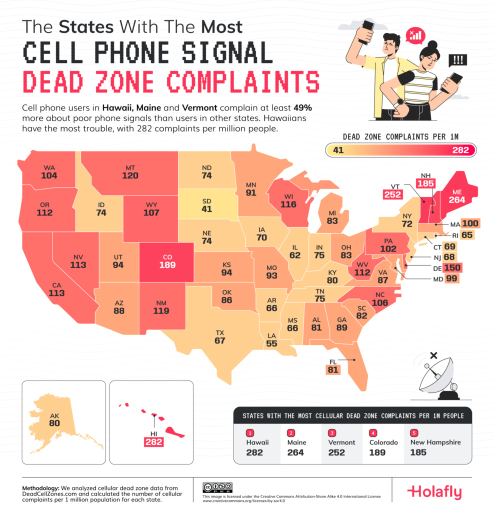 Visiting an area that doesn’t offer a good cell signal is not ideal. Did know you that customers in Hawaii, Maine, and Vermont have the most issue as far as dead zones are concerned? This infographic from Holafly takes a closer look: